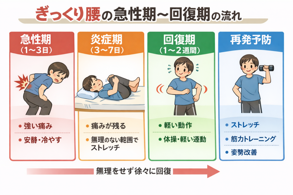 「動いた方がいい?」と迷う方も多いですが、急性期に無理して動くと炎症が長引くことがあります。最低限の移動にして、痛みを増やさない範囲で生活するのがコツです。