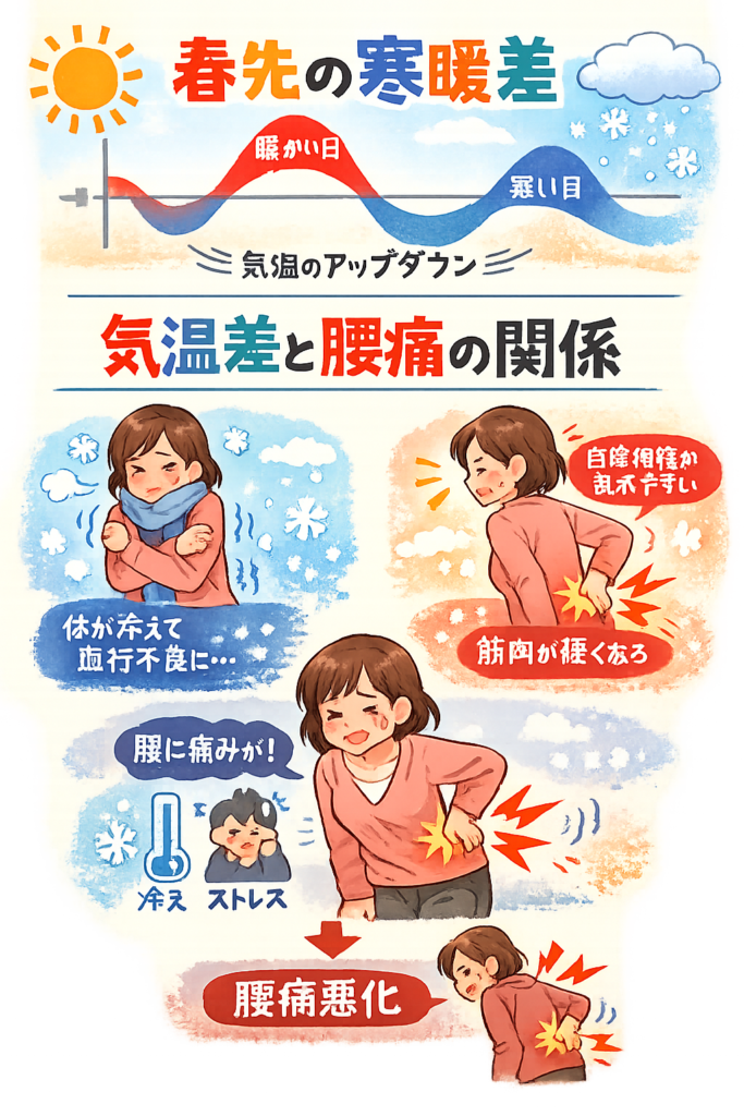 春先は「ぎっくり腰になった」「腰が伸びない」「朝起きるのがつらい」という相談が増えやすい季節です。理由はシンプルで、季節の変わり目は体にとって“外部環境のストレス”が大きいから。